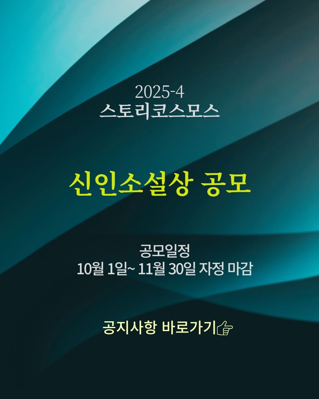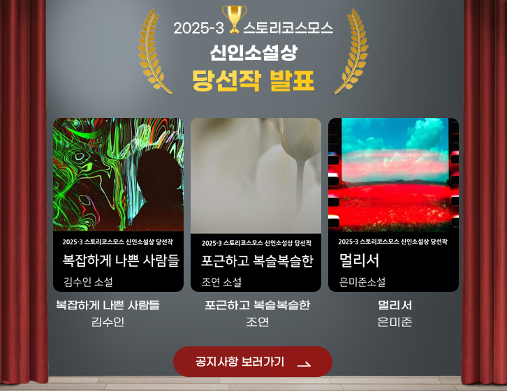 - 발표 : 3월말 / 6월말 / 9월말 / 12월말(마감 날짜 이후 접수된 작품들은 다음 분기 심사 대상으로 자동 이월)