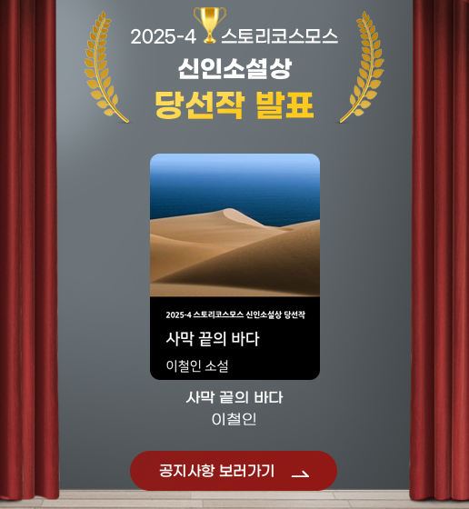 스토리코스모스의 신인 소설상 공모전은 다수당선제를 원칙으로 1년 4분기로 나누어 아래와 같이 진행됩니다. 많은 관심과 성원 바랍니다.